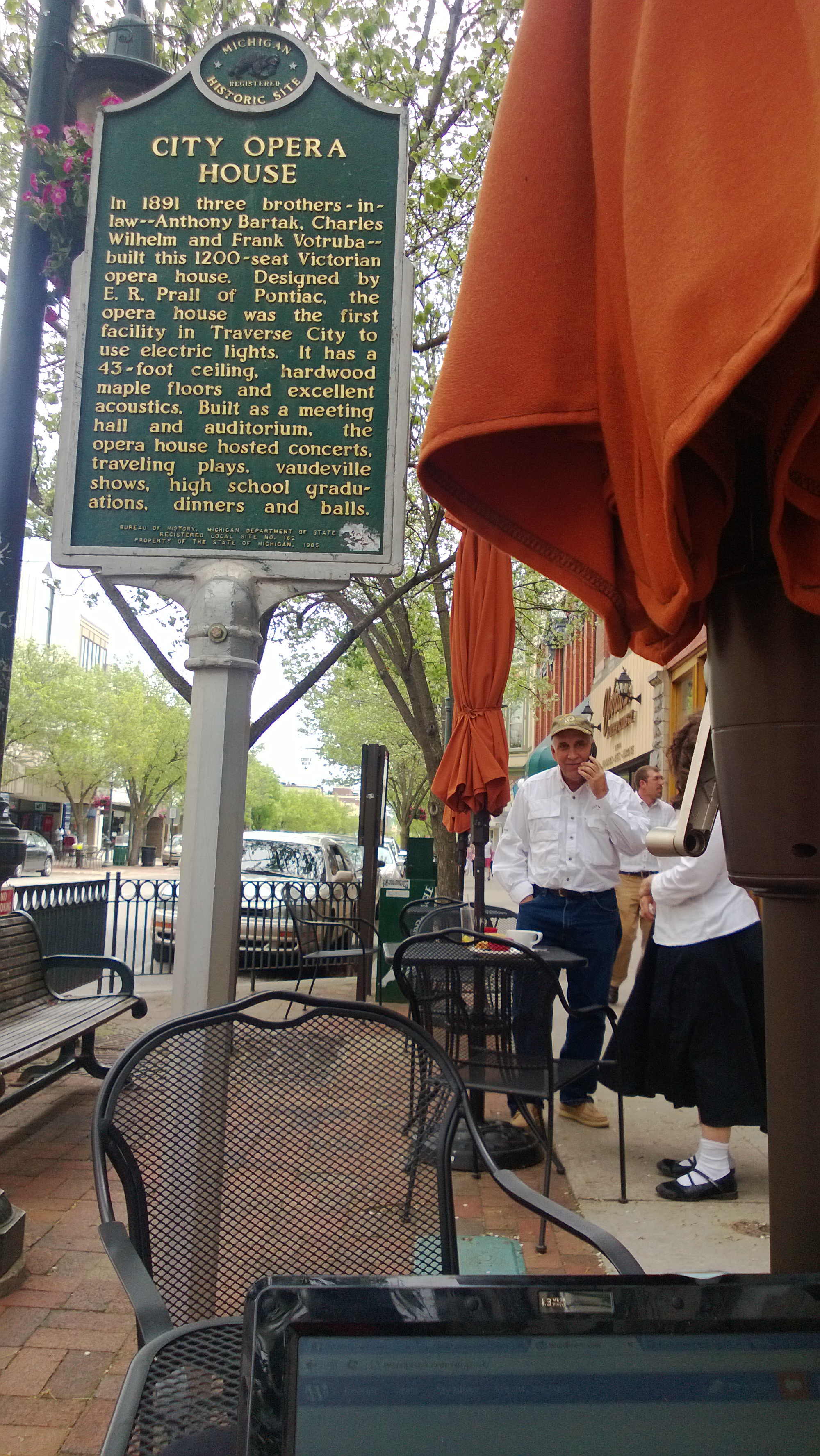 As I sit here writing this little message, three different teams of elementary school kids have passed by on a little treasure hunt their class is doing here in Downtown Traverse City, Michigan.  I happen to be sitting under the historic market that denotes the answer to one of  the questions they are hunting for ‘when was the TC Opera House built?’  Well the answer is…1891 when three brothers-in-law built the 1200 seat Victorian showpiece.  Each cluster of kids has come right over to my table,  And each has taken a few minutes to love on my dog, Bear.  It’s a small thing, but given the lovely interactions we’ve both had with the kids?  That’s good measured.